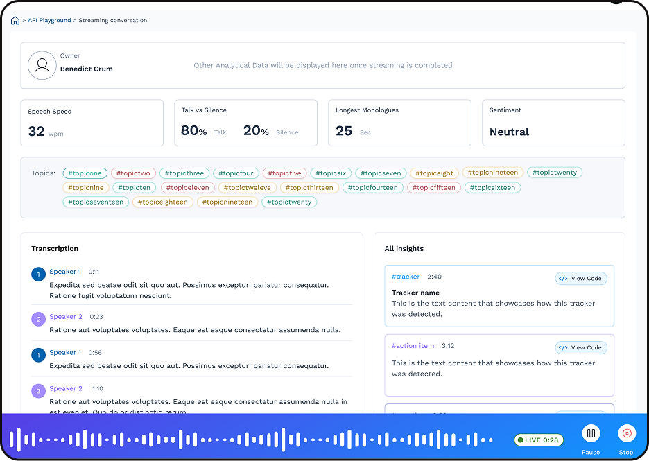 • Live transcription and analytics on the “Dynamic Dashboard” transformed audio into engaging, real-time insights.